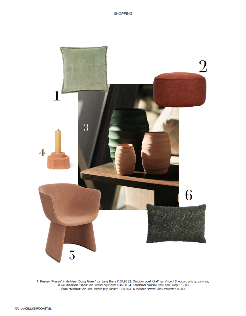 - Publicaties in toonaangevende Belgische en internationale design- en lifestylemedia zoals Weekend Knack, Landelijke Woonstijl, Déco Idées maar ook in vakpers zoals Interior Daily en Interieur Journaal.